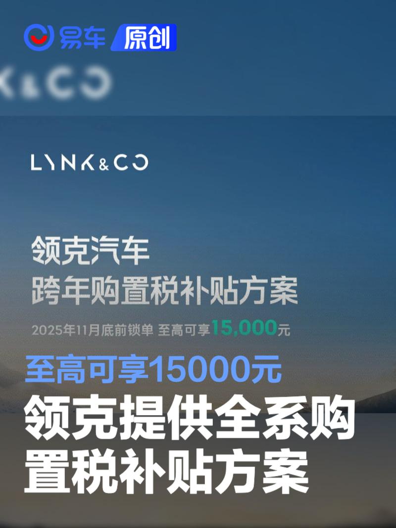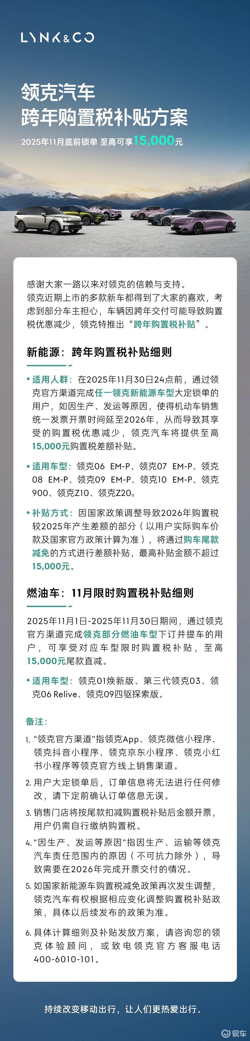 具体来看,新能源车型方面2025年11月30日24点前,通过领克官方渠道完成任一领克新能源车型大定锁单的用户,如因生产、发运等原因,使得机动车销售统一发票开票时间延至2026年,从而导致其享受的购置税优惠减少,领克汽车将提供至高15000元购置税差额补贴。