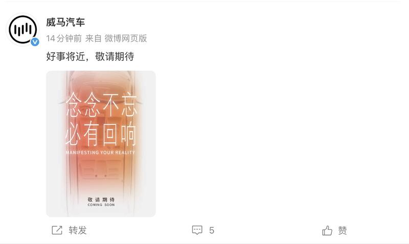 易车讯 11月3日,久未发生的威马汽车在官微宣布“好事将近,敬请期待“。9月6日,威马汽车发布重组情况的说明。根据2025年4月3日法院裁定批准的重整计划,深圳翔飞汽车销售有限公司(以下简称“翔飞”)已接管威马四公司,正在全力以赴推动威马EX5和E5车型在温州基地快速恢复量产。