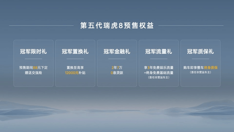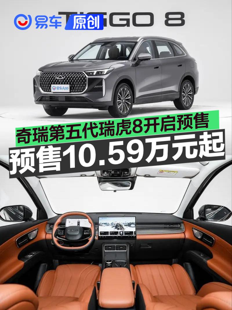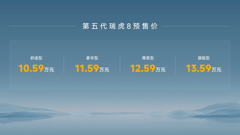 第五代瑞虎8 官方预售价 车型 预售价(万元) 舒适型 10.59 豪华型 11.59 尊贵型 12.59 旗舰型 13.59
