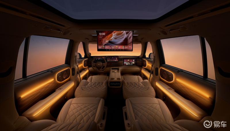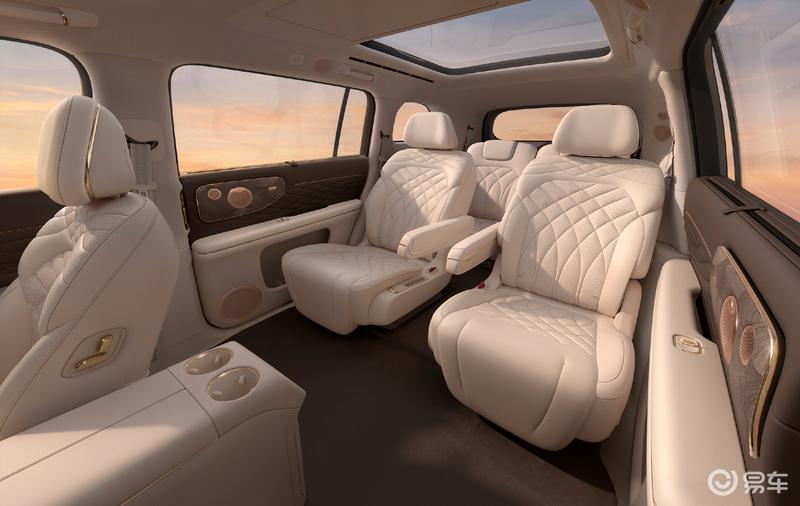 智己LS9采用2+2+2的六座布局,后排配备了21.5英寸车顶娱乐屏,第二排配备了独立座椅,并且还加入了腿托,座椅支持通风、加热以及按摩功能。值得一提的是,第二排座椅还可放平,进一步提升了内部乘坐空间。