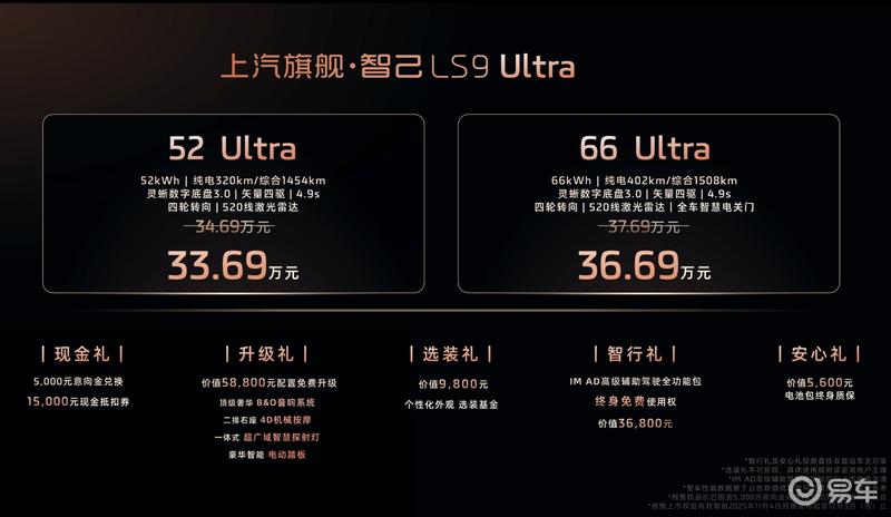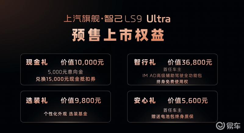 易车讯 11月4日,正式发布并开启预售,包含两款车型,预售权益价区间33.69-36.69万元。智己LS9定位全尺寸SUV,搭载七项行业首发黑科技,全系标配520线超视域激光雷达,动力方面采用智己“恒星”超级增程系统,纯电续航可达402km。官方表示,智己LS9将于11月中旬正式上市。