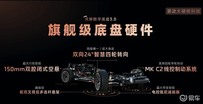 智己LS9搭载灵蜥数字底盘3.0,采用150mm双腔闭式智慧空气悬架和灵蜥智能控制中枢,具备双向24°智慧四轮转向能力,转弯半径只有4.95m。此外,智己LS9还搭载MK C2线控制动系统,实现100%制动能量回收,配合灵蜥数字底盘3.0,制动性能更加优秀。