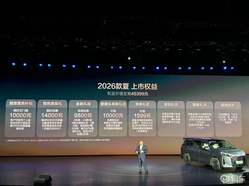 新车上市的同时官方还宣布价值20000元双色车漆限时选装价格6000元,此外还推出价值至高45399元购车权益,包括1万元超级置换补贴、至高贴息9800元等多项权益。