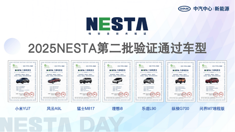 截至本届电安全大会,今年共有14款车型通过NESTA六维电安全验证。问界M7增程版、纵横G700、乐道L90、理想i8、猛士M817、风云A9L、小米YU7共7款车型第二批通过验证。