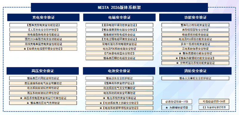基于一年来的验证总结及实际事故中的典型工况,结合行业内三电技术的发展趋势,NESTA 2026版引入更多工况串行测试方案,从而使验证更加贴近实际场景。在2025版基础上,NESTA 2026版优化、合并5个验证项目,并基于行业发展需求新增多个测试内容,形成11个必选项,27个可选项的体系框架,以满足企业多样化、场景化的技术验证需求。