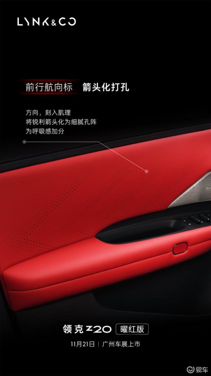 据悉,领克Z20曜红版将采用银色外观和红色内饰,本次官方公布的是红色内饰细节,新车采用了法拉利/保时捷百万豪车同样红,分外抢眼。细节方面,新车采用赤霞珠色皮质座椅,凸显高级品质感。
