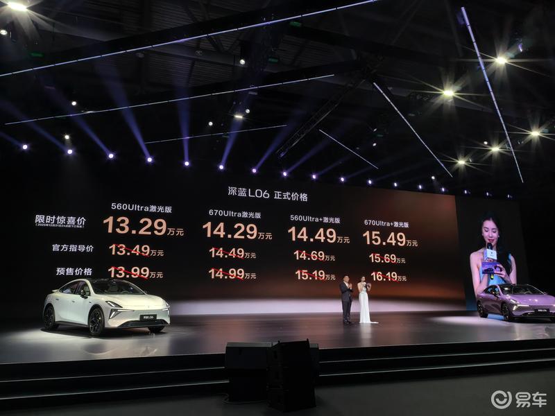 深蓝L06正式上市 车型 官方指导价(万元) 限时惊喜价(万元) 560Ultra激光版 13.49 13.29 670Ultra激光版 14.49 14.29 560Ultra+激光版 14.69 14.49 670Ultra+激光版 15.69 15.49
