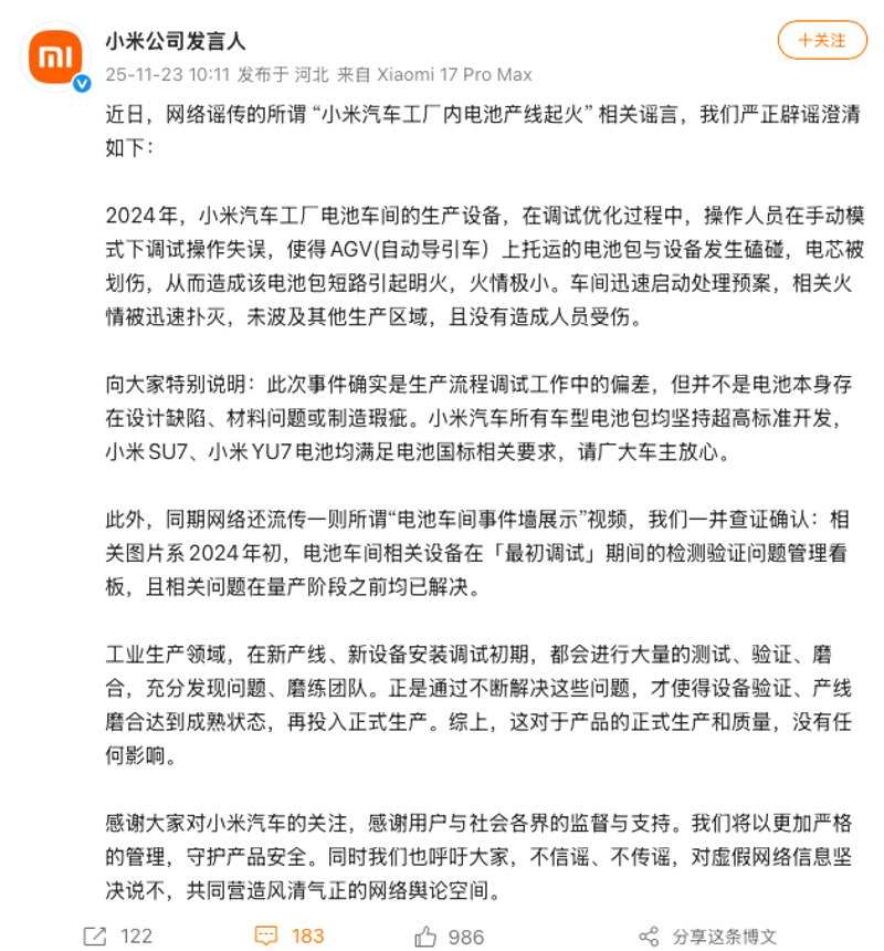 2024年,小米汽车工厂电池车间的生产设备,在调试优化过程中,操作人员在手动模式下调试操作失误,使得AGV(自动导引车)上托运的电池包与设备发生磕碰,电芯被划伤,从而造成该电池包短路引起明火,火情极小。车间迅速启动处理预案,相关火情被迅速扑灭,未波及其他生产区域,且没有造成人员受伤。 向大家特别说明:此次事件确实是生产流程调试工作中的偏差,但并不是电池本身存在设计缺陷、材料问题或制造瑕疵。小米汽车所有车型电池包均坚持超高标准开发,小米SU7、小米YU7电池均满足电池国标相关要求,请广大车主放心。 此外,同期网络还流传一则所谓“电池车间事件墙展示”视频,我们一并查证确认:相关图片系2024年初,电池车间相关设备在「最初调试」期间的检测验证问题管理看板,且相关问题在量产阶段之前均已解决。 工业生产领域,在新产线、新设备安装调试初期,都会进行大量的测试、验证、磨合,充分发现问题、磨练团队。正是通过不断解决这些问题,才使得设备验证、产线磨合达到成熟状态,再投入正式生产。综上,这对于产品的正式生产和质量,没有任何影响。 : 武昊天