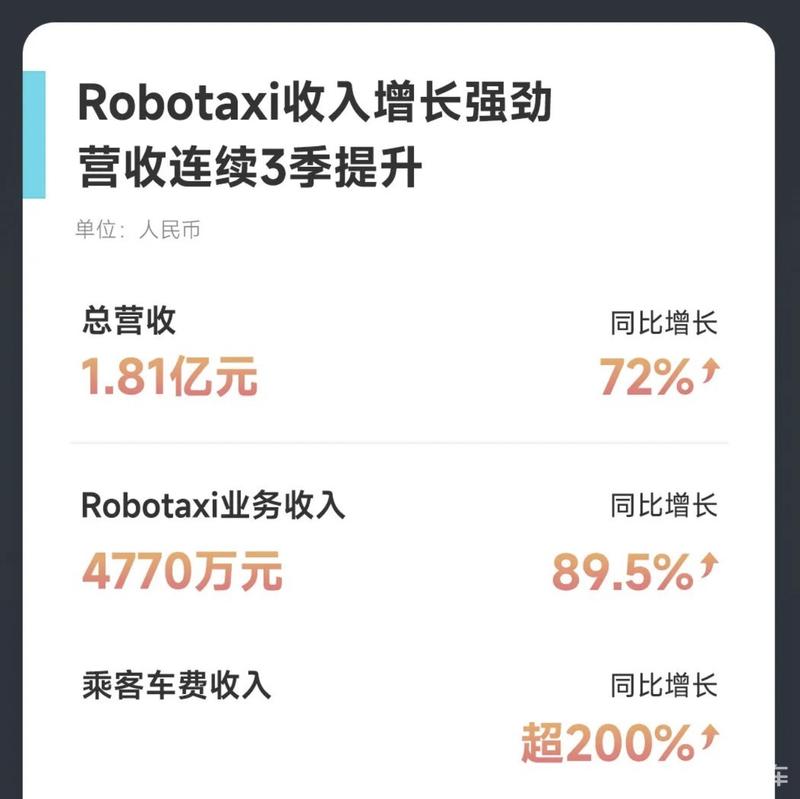 易车讯 11月25日,小马智行发布2025年第三季度财报,总营收1.81亿元,同比增长72%;Robotaxi业务收入4770万元,同比增长89.5%;乘客车费收入同比增长超200%。