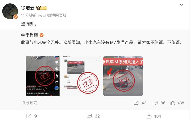 易车讯 11月26日,小米汽车副总裁李肖爽在社交媒体上表示,小米汽车没有M7型号产品 请大家不信谣、不传谣。新上任的小米集团公关部总经理徐洁云随后对此消息进行了转发,并留言“望周知“。
