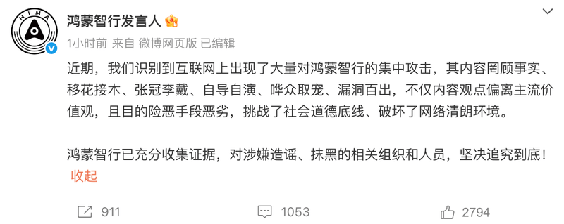 官方表示,鸿蒙智行已充分收集证据,对涉嫌造谣、抹黑的相关组织和人员,坚决追究到底。