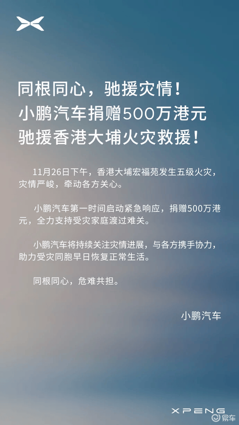 易车讯 11月27日,小鹏汽车官方宣布捐赠500万港元,驰援香港大埔火灾救援,全力支持受灾家庭渡过难关。