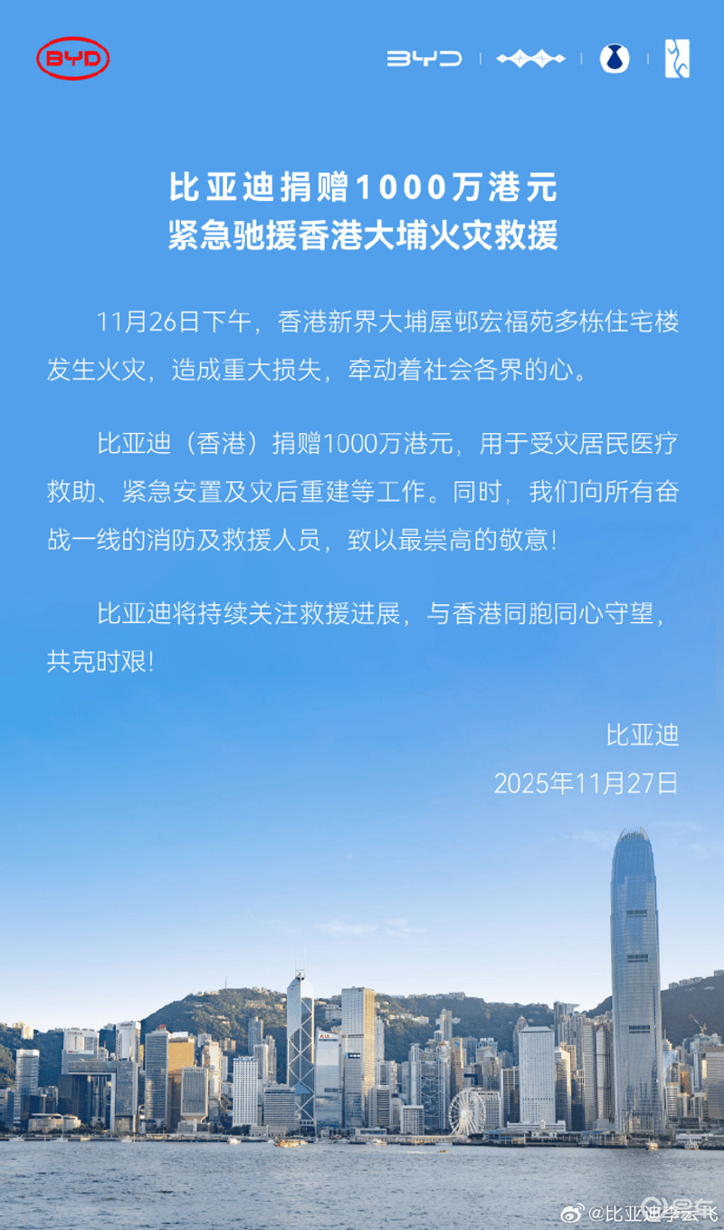 比亚迪(香港)捐赠1000万港元,用于受灾居民医疗救助、紧急安置及灾后重建等工作。同时,我们向所有奋战一线的消防及救援人员,致以最崇高的敬意。比亚迪将持续关注救援进展,与香港同胞同心守望共克时艰。
