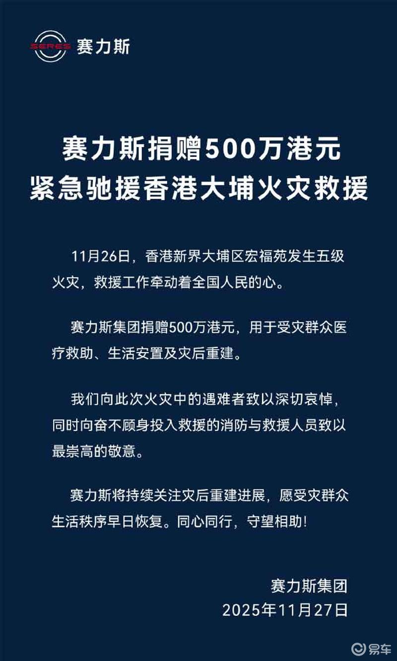 易车讯 11月27日,赛力斯集团宣布捐赠500万港元紧急驰援香港大埔火灾救援!同心同行,守望相助!愿同胞平安坚强。