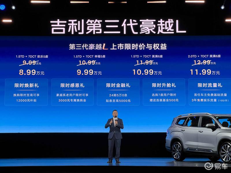 易车讯 11月27日,吉利第三代正式上市,包含四款车型,官方指导价区间9.99-12.99万元,限时权益价区间8.99-11.99万元。新车采用最新的家族设计语言,并在配置和空间上进行了全面升级革新。动力方面在保留2.0T发动机的基础上新增1.5T版本。