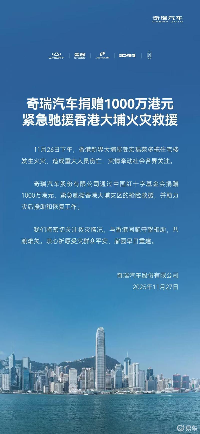 易车讯 11月27日,奇瑞汽车股份有限公司通过中国红十字基金会捐赠1000万港元,紧急驰援香港大埔灾区的抢险救援,并助力灾后援助和恢复工作。