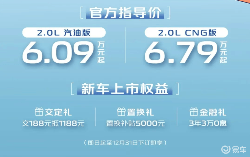 同时,即日起至12月31日下订即享新车上市权益,包括交定礼188元抵1188元,置换补贴5000元以及3年3万0息的金融礼。