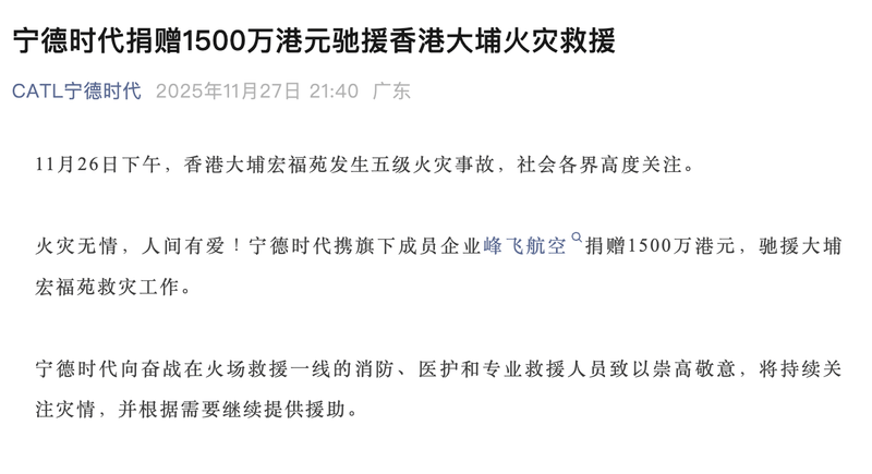 易车讯 日前,宁德时代携旗下成员企业峰飞航空捐赠1500万港元,驰援大埔宏福苑救灾工作。