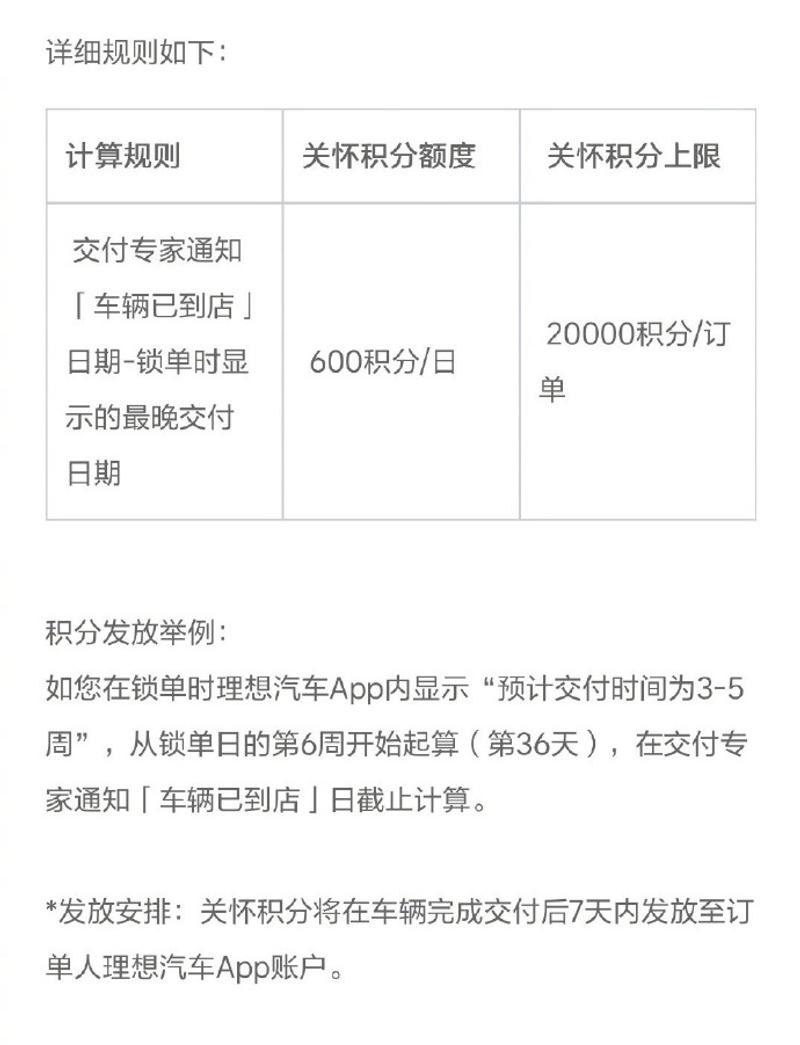 此外,理想汽车宣布了具体的用户关怀政策:对于因公司原因造成交付超期的用户,将按照每日600积分的标准进行发放(1积分相当于1元,即60元/天)。值得一提的是,该政策可追溯适用于已提车的用户。
