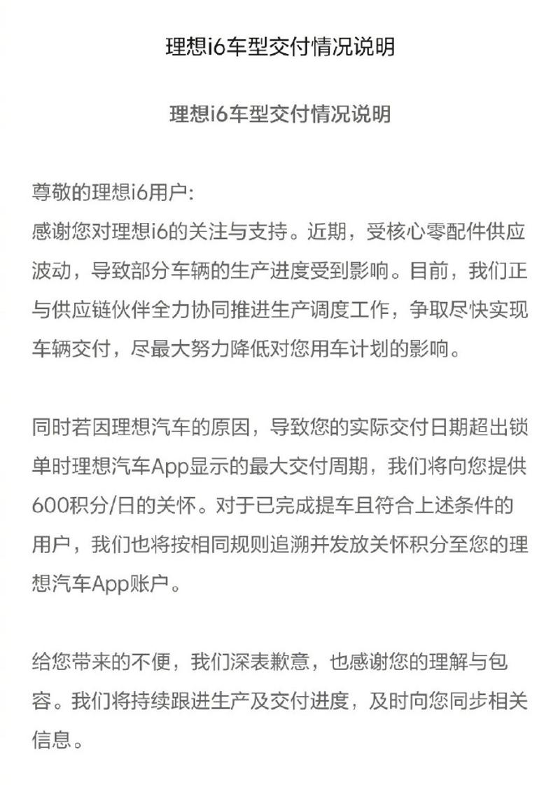 易车讯 日前,理想汽车App发布《关于理想i6交付情况的说明及用户关怀方案》,针对近期因核心零部件供应波动致使理想i6车型交付延期的情况,向用户正式致歉,并公布具体关怀措施。