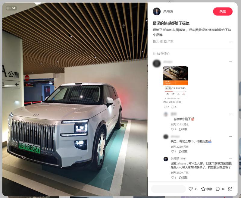 评论区中,有网友分享关于2024款极氪001辅助驾驶软硬件系统更换的众筹页面,希望关海涛能帮助众筹成功。关海涛回应称:对不起大家,但这个解决方案也算是最大化帮大家推动解决了,我也算没啥遗憾了。