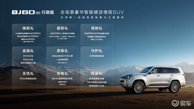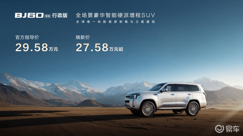 易车讯 11月30日,增程行政版正式上市,官方指导价29.58万元,焕新价27.58万元起。作为BJ60系列的新增车型,BJ60增程行政版在设计方面与现款车型保持一致,但在配置上加入了车载卫星通信、制氧机等。