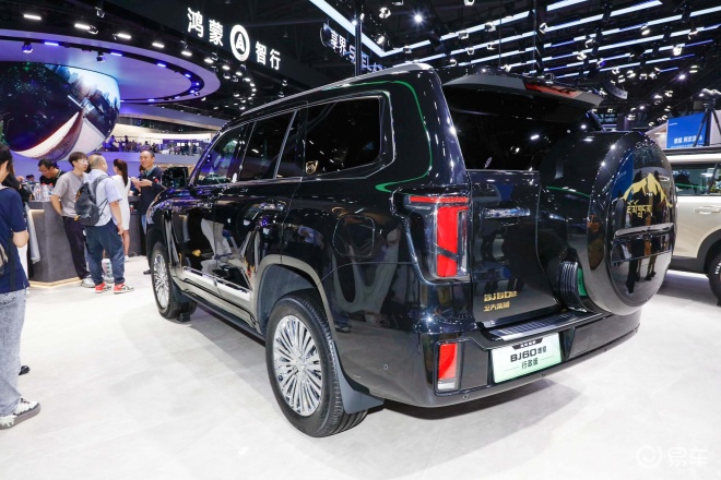 侧面部分,整体设计线条与现款车型一致,但同样加入了亮黑色的装饰进行点缀,车尾尾灯风格取消了灯腔内的红灯笼造型,在视觉上更显扁平化风格,车尾标为“BJ60e”,显示了车型采用魔核电驱的身份。