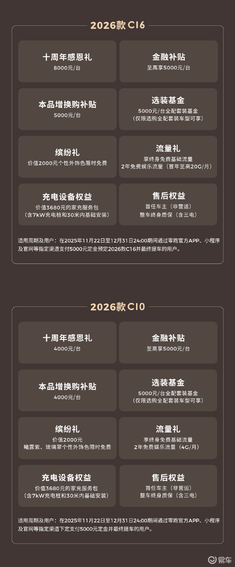 2026款C16享8000元现金优惠,至高5000元金融补贴,5000元本品增换购补贴,5000元选装基金,个性外饰色限时免费。2026款C10享4000元现金优惠,至高5000元金融补贴,4000元本品增换购补贴。