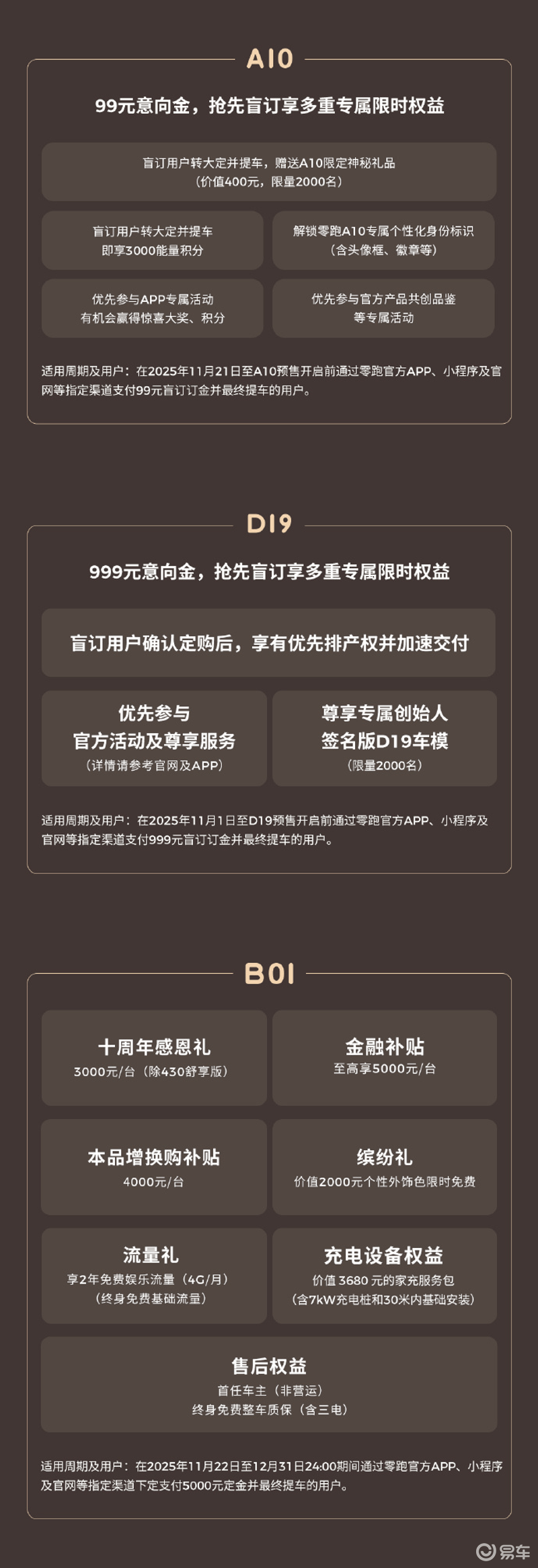 零跑A10推99元意向金可享多重专属限时权益,盲订用户转大定并提车,赠送A10限定神秘礼品以及3000能量积分。零跑D19推999元意向金,盲订用户确认订购后,享有优先排产权并加速交付以及限量2000名签名版D9车模。B01推出3000元/台感恩现金礼,至高5000元金融补贴以及本品赠换购补贴4000元等权益。