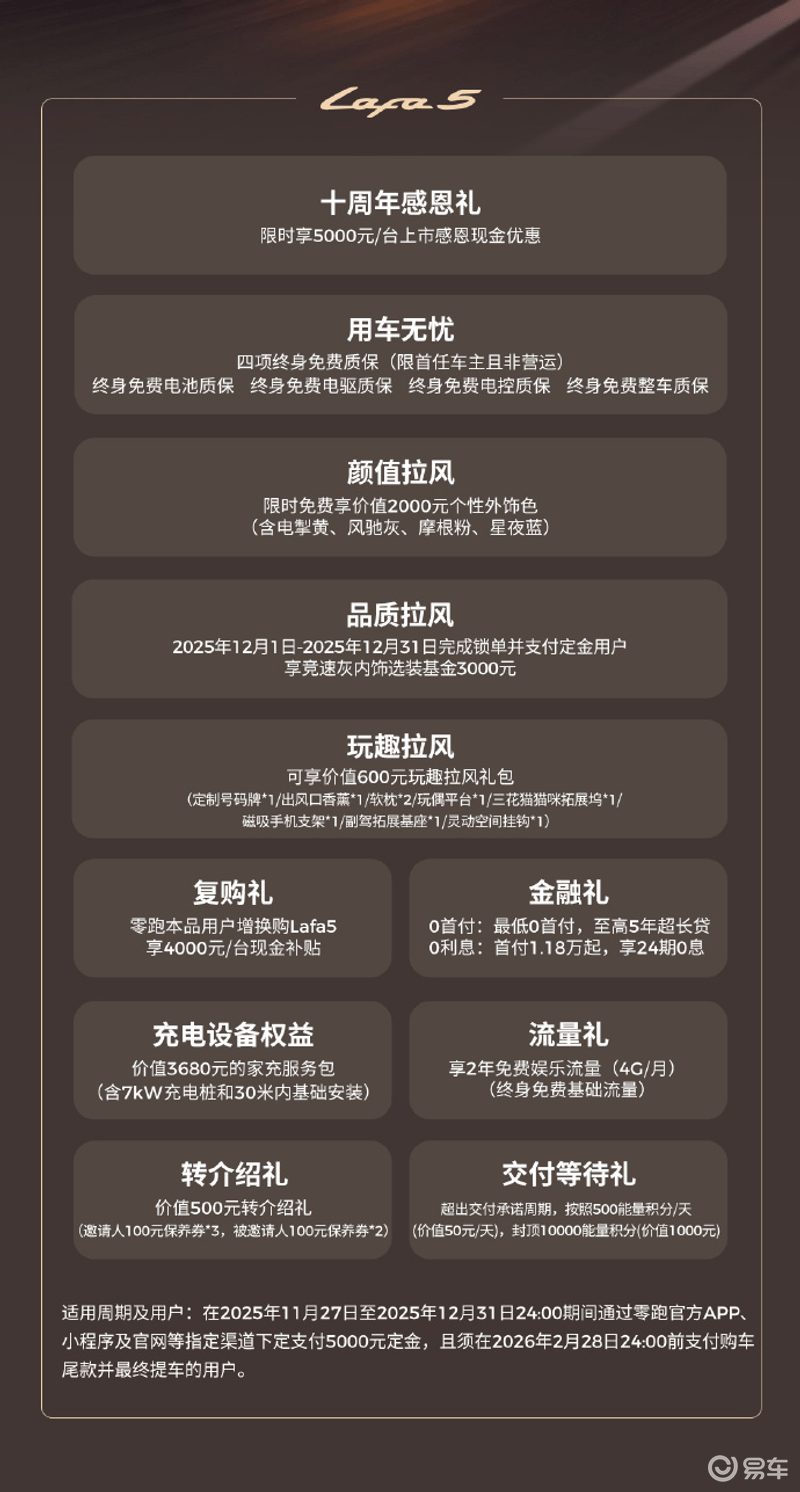 具体来看,Lafa5限时享5000元/台上市感恩现金优惠;四项终身免费质保;限时免费享价值2000元个性外饰色以及零跑用户增换购享4000元现金补贴等多重购车礼遇。