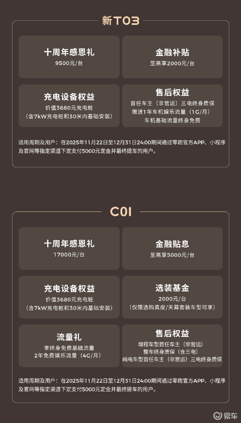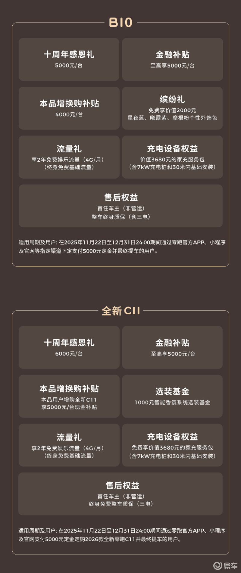 零跑B10推出5000元十周年感恩礼;至高5000元金融补贴;本品赠换购补贴4000元以及限时免费享价值2000元个性外饰色的多重购车礼。全新C11推出6000元十周年感恩礼至高5000元金融补贴;本品赠换购补贴5000元。