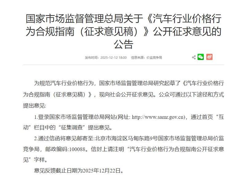 易车讯 12月12日,国家市场监督管理总局发文表示,为规范汽车行业价格行为,总局研究起草了《汽车行业价格行为合规指南(征求意见稿)》,现向社会公开征求意见。意见反馈截止日期为2025年12月22日。