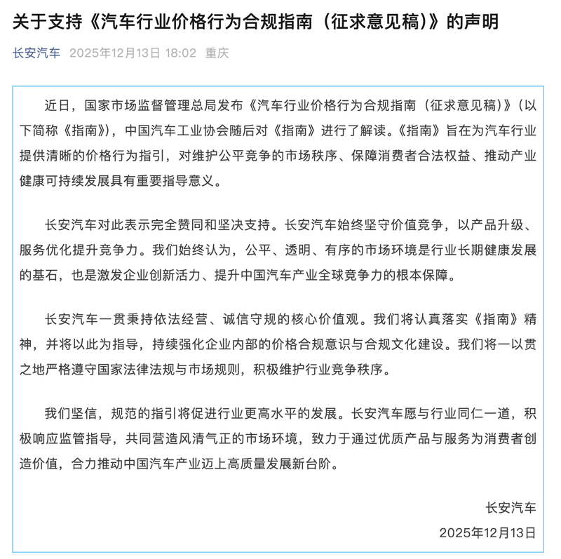 长安汽车对此表示完全赞同和坚决支持。长安汽车始终坚守价值竞争,以产品升级、服务优化提升竞争力。我们始终认为,公平、透明、有序的市场环境是行业长期健康发展的基石,也是激发企业创新活力、提升中国汽车产业全球竞争力的根本保障。