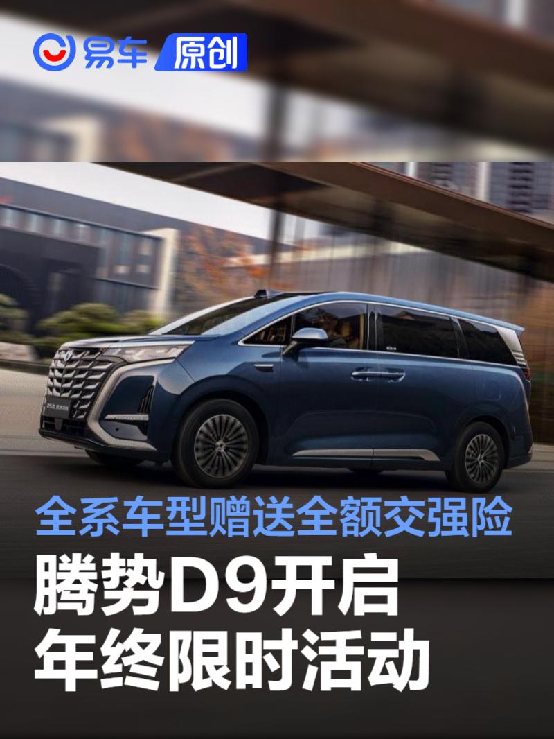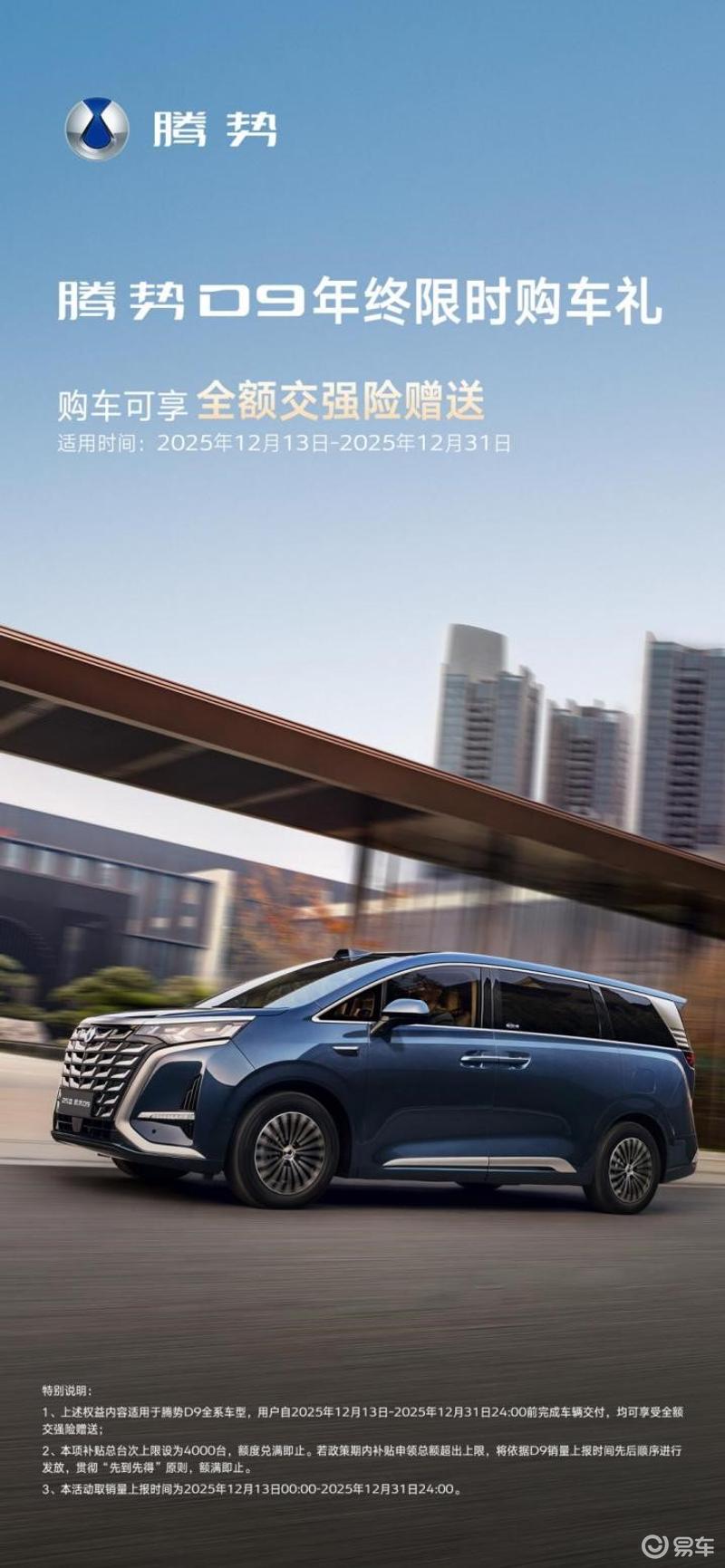 易车讯 日前,汽车正式开启“腾势 D9·感恩 30 万+”年底感恩活动,即日起至2025年12月31日,凡购买并完成交付腾势D9的用户,均可享受全额赠送交强险权益,腾势D9全系车型均可参与。本次补贴上限为4000台,额度兑满即止,若政策期内补贴申领总额超出上限,将依据D9销量上报时间先后顺序进行发放。