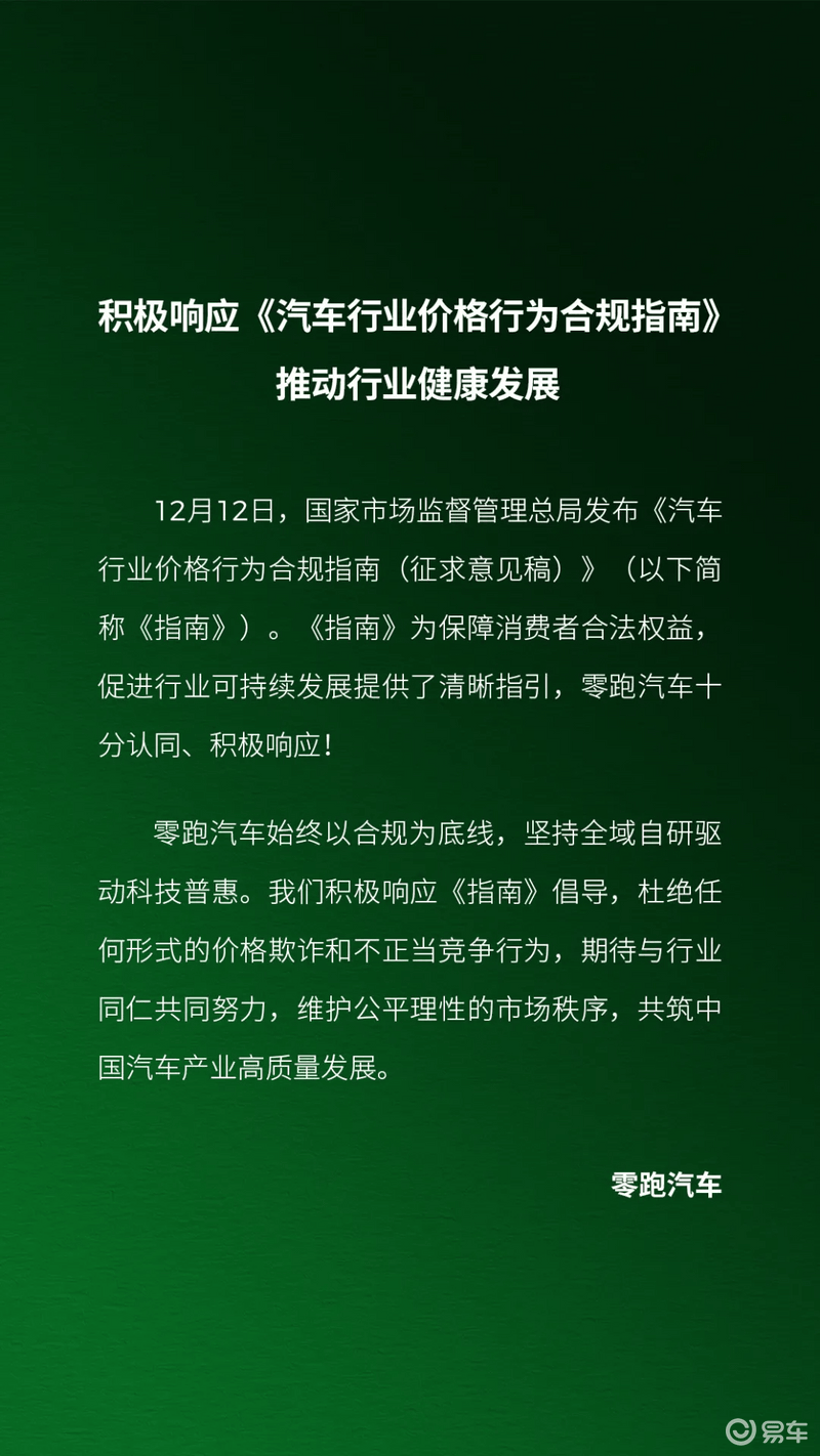 12月12日,国家市场监督管理总局发布《汽车行业价格行为合规指南(征求意见稿)》(以下简称《指南》)。《指南》为保障消费者合法权益,促进行业可持续发展提供了清晰指引,零跑汽车十分认同、积极响应! 零跑汽车始终以合规为底线,坚持全域自研驱动科技普惠。我们积极响应《指南》倡导,杜绝任何形式的价格欺诈和不正当竞争行为,期待与行业同仁共同努力,维护公平理性的市场秩序,共筑中国汽车产业高质量发展。