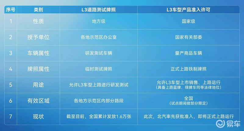 易车讯 日前,北汽集团旗下极狐汽车获批工业和信息化部自动驾驶车型产品准入许可,即将在北京市限定区域内开展L3级有条件自动驾驶上路通行试点。在L3级自动驾驶的推进过程中,两种官方许可常被混淆:一是由地方相关机构发放的“道路测试牌照”,二是此次由国家有关部委发放的“产品准入许可”。
