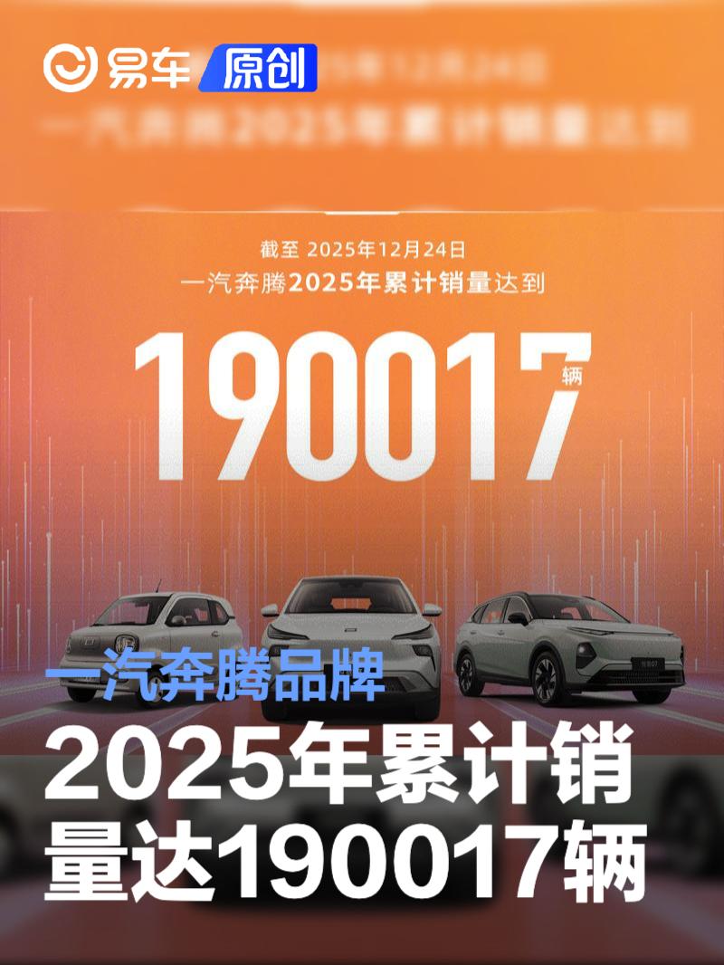 易车讯 12月24日,一汽奔腾官方表示,截至2025年12月24日,一汽奔腾品牌2025年累计销量达190017辆,创20年销量历史新高。