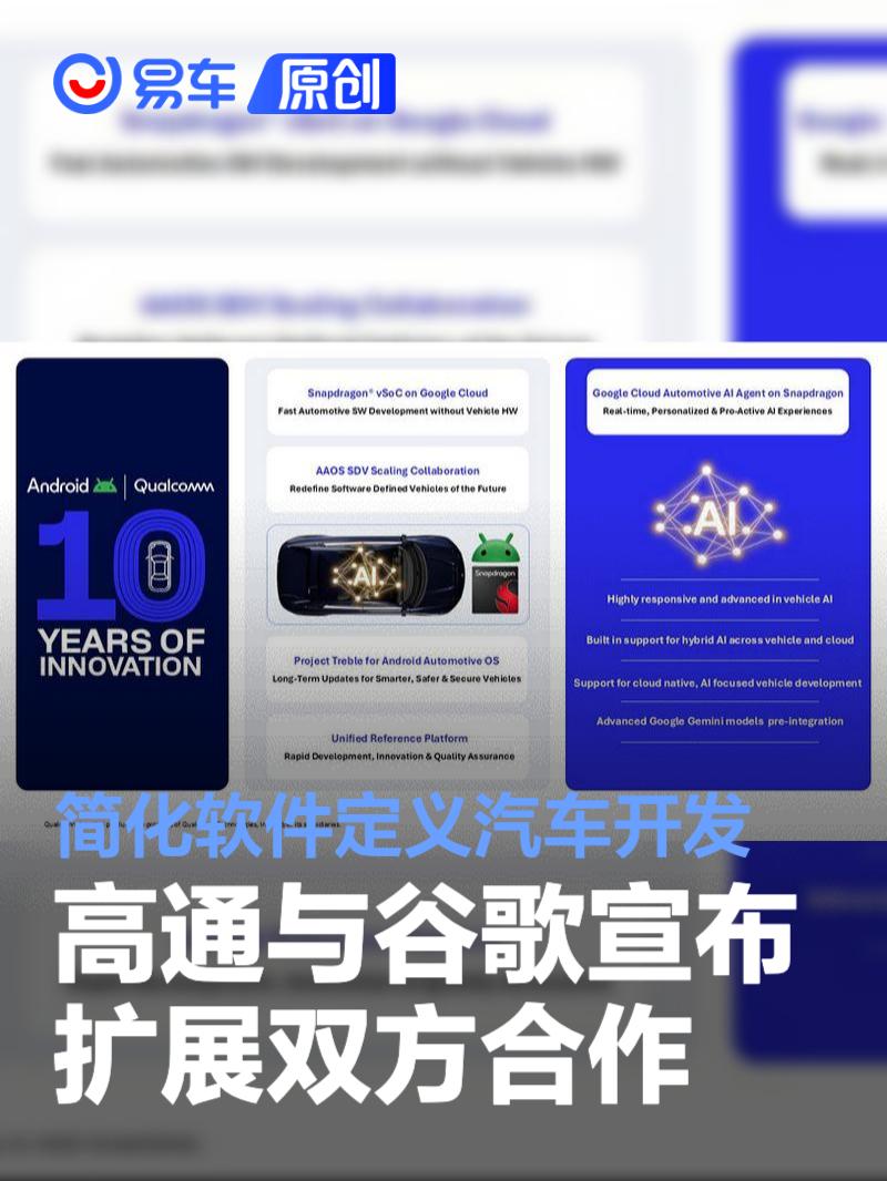 易车讯 在2026年国际消费电子展(CES 2026)上,高通技术公司与谷歌今日宣布扩展双方合作,进一步深化其在汽车行业已持续超过十年的成功合作基础。此次合作关系的加深,为未来数年汽车产业的转型奠定领先的技术基础,加速产品上市进程,并在快速演进的智能体AI时代拓展全新能力。