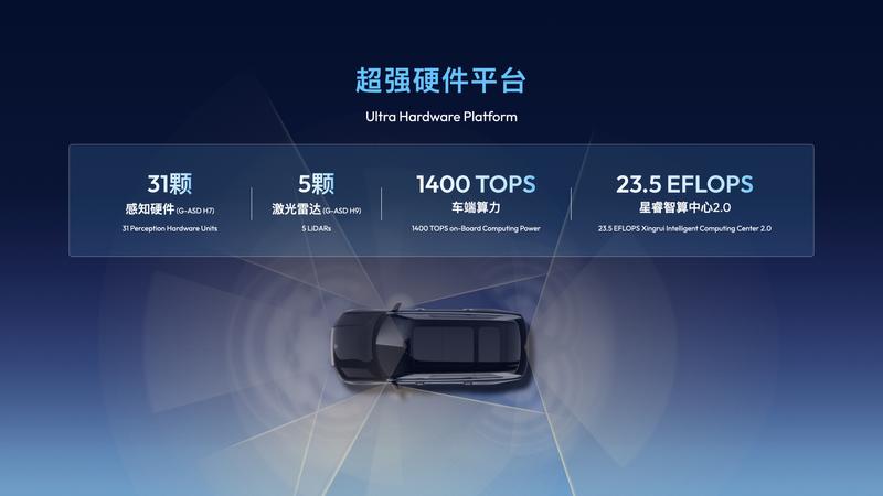 此外,千里浩瀚G-ASD配备了行业领先的感知硬件。千里浩瀚各层级方案均有同级领先的芯片算力带宽,例如千里浩瀚H7采用芯片及双Orin芯片,现售车型配备激光雷达及多达31颗感知元器件;千里浩瀚H9更采用两颗Thor芯片,带来1400TOPS的同级最高算力,标配5颗激光雷达,实现3重360°全维覆盖。