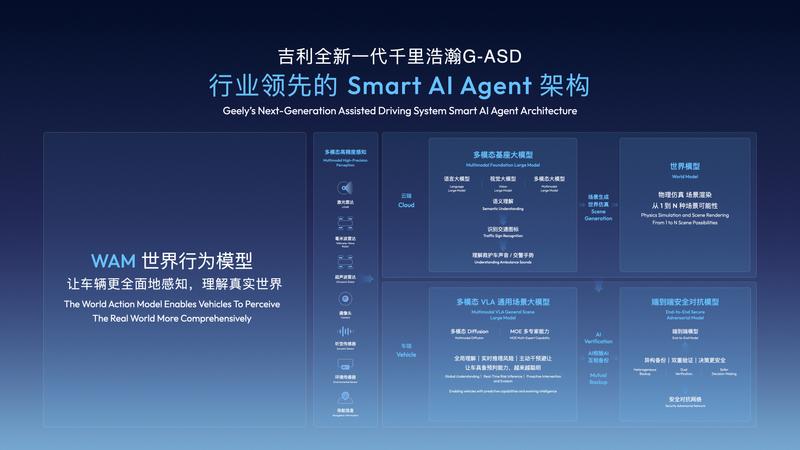 在2025年CES展会区间,吉利发布了智能汽车行业首个全域AI技术体系,并将AI科技深度融入智能汽车的架构、动力、底盘、座舱、辅助驾驶等全链路。为了让智驾域、座舱域、底盘域等各个域之间充分实现跨域融合,吉利今年发布了具备自我反思与进化能力的世界行为模型——WAM(World Action Model),构建统一的“整车大脑”。
