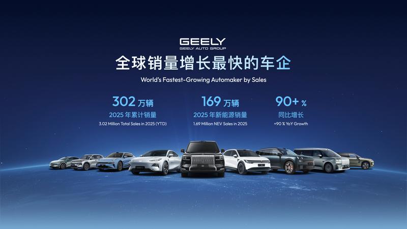 2026年,在全域AI 2.0的全面助推下,吉利推出约10款全新车型,冲刺345万辆的全年销量目标。