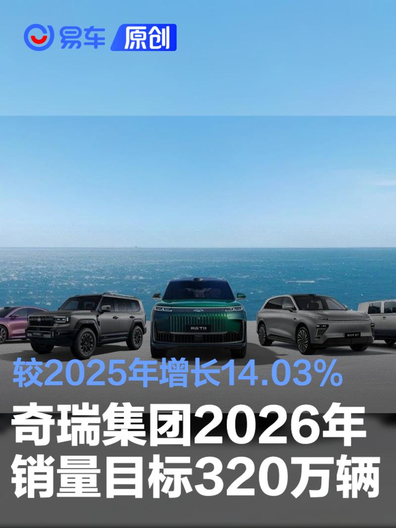 易车讯 1月6日,奇瑞集团发布2026年销量目标,集团目标320万辆,较2025年增长14.03%。其中,奇瑞汽车股份有限公司(简称奇瑞汽车)携旗下五大品牌,将实现300万辆销量目标,同比增长14.01%。