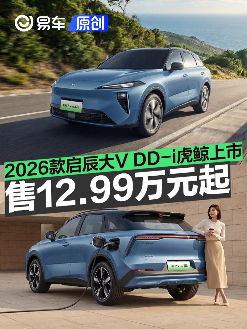 易车讯 1月13日,2026款启辰大V DD-i虎鲸正式上市,售价12.99-14.9万元。作为增配车型,新车在续航、补能、油耗等方面均有一定程度的升级。即日起下定,并于2026年2月28日(含)前完成交车,即可享受上市权益价,还有首任车主(个人、非营运)至高整车6年/15万公里质保,三电终身质保,零利息和低利息金融方案等多项权益