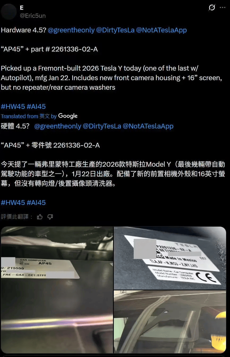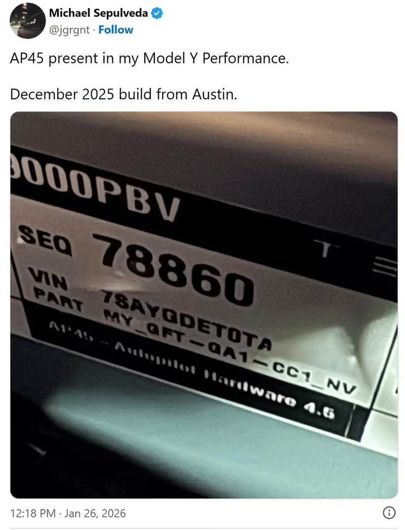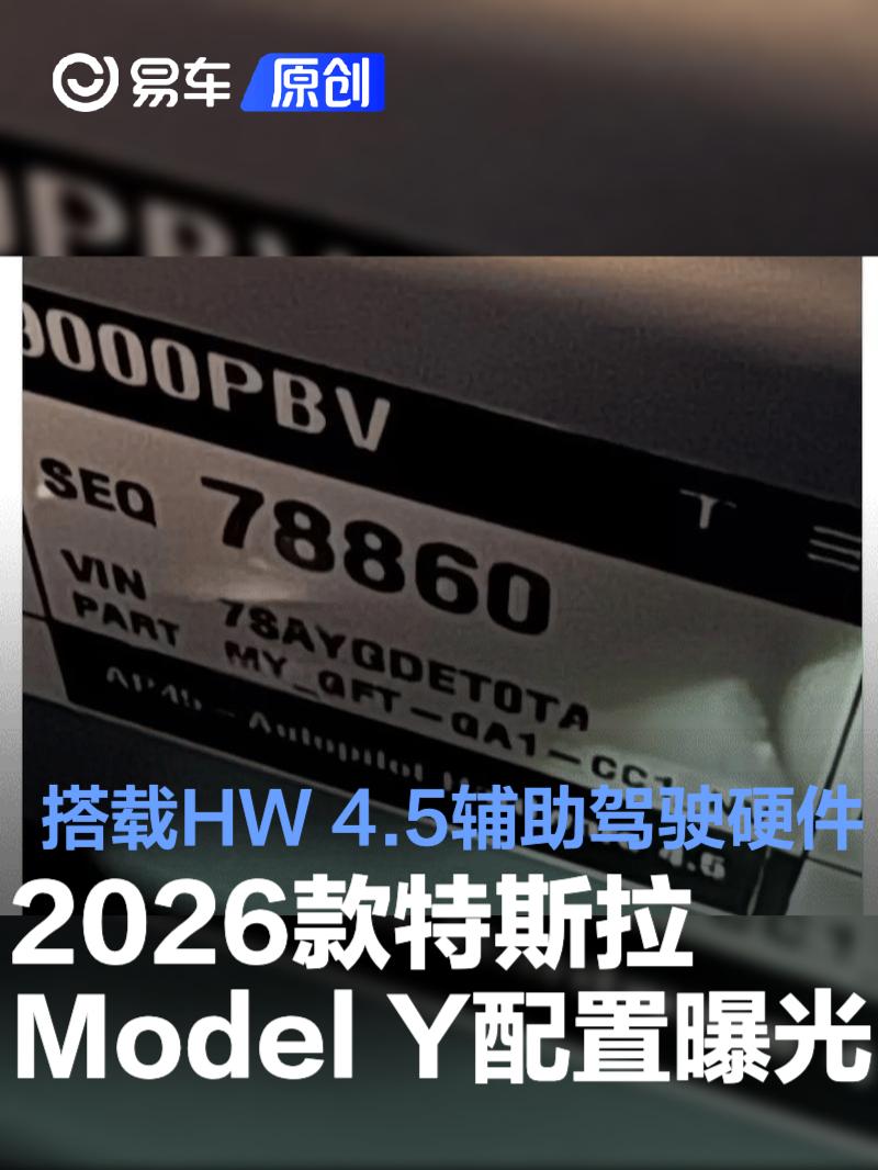 易车讯 据媒体报道称,2026款汽车搭载了HW4.5辅助驾驶硬件。新车手套箱下方拥有型号为“AP45”的辅助驾驶计算机,零件编号“2261336-02-A”。