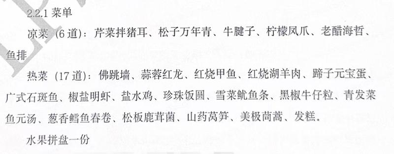 根据网络上的图片显示,零跑汽车年会菜单共拥有6道凉菜,芹菜拌猪耳、松子万年青、牛腱子、柠檬凤爪、老醋海哲、鱼排;17道热菜:佛跳墙、蒜蓉红龙、红烧甲鱼、红烧湖羊肉、蹄子蛋广式石斑鱼、椒盐明虾、盐水鸡、珍珠饭圆、雪菜鱿鱼条、黑椒粒、青发菜鱼元汤、葱香鳕鱼春卷、松板鹿茸菌、山药莴笋、美极茼蒿、发糕。以及水果拼盘一份。