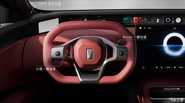 新车内饰进行了诸多细节方面的升级,方向盘增加一键语音和Boost一键加速物理按键,另外DMS疲劳驾驶预警系统也得到优化,门板扶手区域优化了应急拉手并新增车窗开关按键,下方新增开放式门板储物区,车顶采用天鹅绒材质进行包裹,后排则增加AVATR MAG连接点。