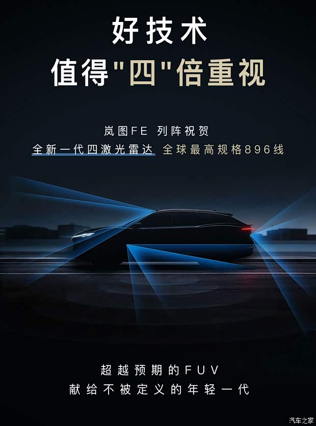 [汽车之家 资讯] 3月5日,我们从岚图汽车官方了解到,旗下全新FUV内部代号岚图FE车型或将搭载四颗全新激光雷达模组,以及最高规格896线激光雷达。根据此前曝光的新车计划来看,岚图FE将于2026年中上市。
