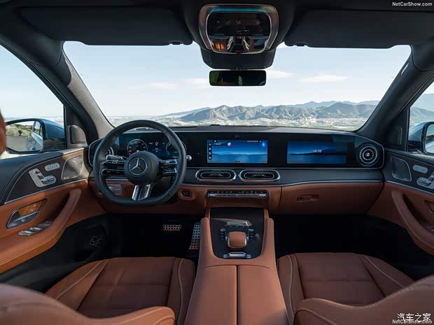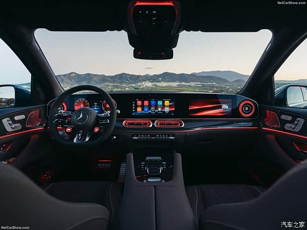 内饰核心变化为MBUX Superscreen超联屏,由12.3英寸仪表+14英寸中控+14 英寸副驾屏组成,科技感拉满。空调出风口改为圆形,方向盘重新设计,保留实体按键与音量滚轮,盲操更便捷。座椅采用全新纹理材质,提供精致缝线与按摩功能,高配车型提供后排独立娱乐、多色氛围灯,豪华感与舒适性全面提升。车内用料大面积软质包裹+木纹/金属饰板,延续奔驰做工水准。GLE53 AMG Hybrid提供AMG专属运动方向盘、金属换挡拨片、红色缝线与碳纤维饰板。