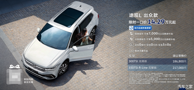 [汽车之家 新车上市] 近日,我们从官方获悉,上汽大众旗下2026款途观L(参数|询价) PRO新增车型正式上市,共推1款车型,售价21.38万元。作为新增车型,300TSI 智悦版在外观、内饰设计方面没有太多改动,但在配置上进行了优化;此外,新车搭载了1.5T涡轮增压四缸发动机。此外,官方还公布了途观L出众款最新限时一口价,14.29万元起。