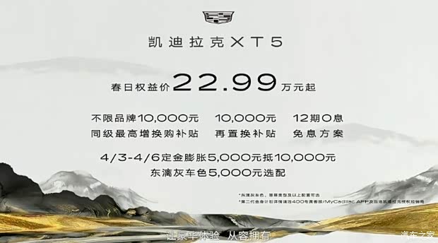 [汽车之家 资讯] 4月3日,2026凯迪拉克春季艺术大赏活动中,凯迪拉克XT5推出春日限时权益价22.99-32.09万元,包括不限品牌10000元同级最高增换购补贴、12期0息金融方案、5年内10000元再置换补贴,叠加限时5000元抵10000元定金膨胀。此次还发布了全新车色东漓灰,限时选配价5000元。此外,还升级第二代“金身计划”,在已有车损超三成免费换新的基础上限时加赠“金质权益”,三年内全车核心部件大额质损同样享受免费换新车,品质安全双重兜底。春日限时权益需在2026年4月3日至2026年4月30日完成下定,限时定金膨胀需在2026年4月3日至2026年4月6日完成下定。